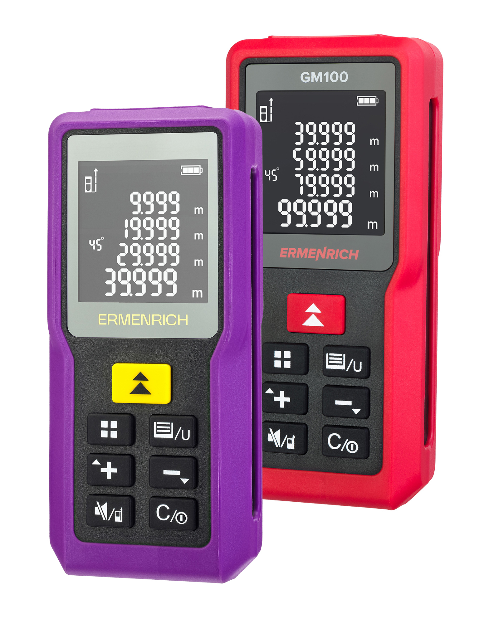Ermenrich Reel PRO GM100 je laserový měřič určený pro měření na stavbách a při rekonstrukcích. Lze jej také použít pro vytyčování hranic pozemků, geodetických pracích a dalších aplikacích, které vyžadují přesné měření lineárních rozměrů objektu, jeho plochy a objemu. Maximální vzdálenost měření je 100 metrů. Laserový měřič může sloužit také jako laserový úhloměr. Díky funkci Pythagorovy věty automaticky vypočítá vzdálenosti po provedení mezilehlých měření. Tato funkce je užitečná zejména v případě, že nemůžete laserový paprsek zaměřit tak, abyste jej mohli přímo vykreslit z jednoho bodu do druhého.